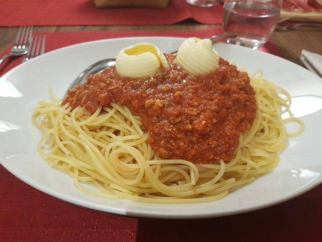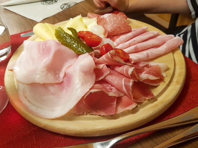 Für das Abendessen fuhren wir nach Laas – berühmt für seinen reinen weißen Marmor. Im Gasthof zur Sonne fanden wir einen freien Tisch und ließen uns eine sehr ordentliche Portion Spaghetti Bolognese und eine Jausenplatte mit Südtiroler Spezialitäten von Käse, Schinken und Wurst schmecken.
