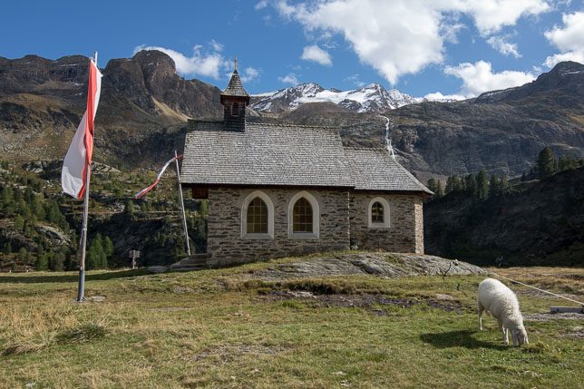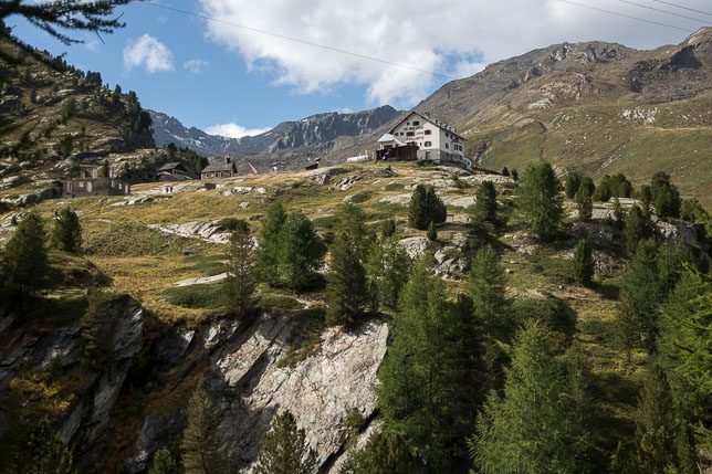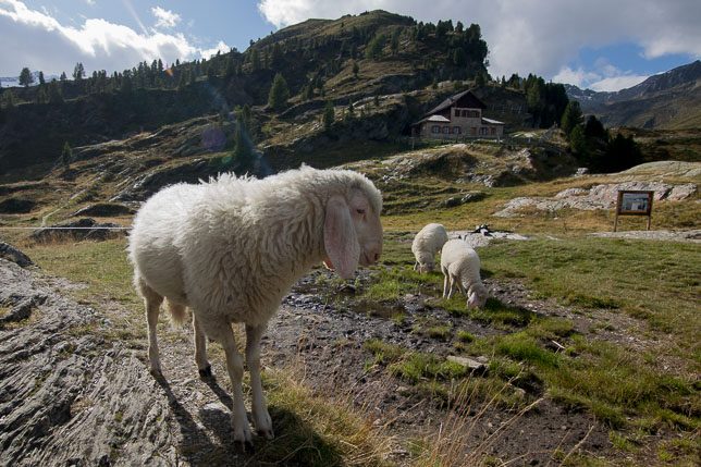 Nun waren es nur noch ein paar Meter bis zur Hütte mit einem herrlichen Ausblick ins Tal und auf die umliegenden Berge, die bereits zum Nationalpark Stilfser Joch gehören. Eine Handvoll Schafe waren weniger an dem Ausblick, sondern an der Nahrungsaufnahme interessiert, verschmähten aber auch nicht die Streicheleinheiten, die Jochen ihnen zukommen ließ.