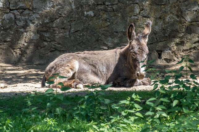 Bei fast 30 Grad im Schatten machten es sich viele der Tiere im Schatten gemütlich oder gar im Inneren einer kühlen Behausung, die für die Besucher nicht einsehbar ist. Die Gehege für Iltis, Marder, Dachs und Luchs waren trotz intensiver Suche verwaist, doch es gab auch Tiere, die sich den neugierigen Blicken der Besucher nicht entziehen konnten, unter anderem zwei Esel, die in der Sonne dösten.