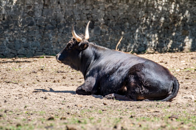 Nicht zum Streicheln geeignet war die nachfolgende Spezies. Ein Auerochse genoss das Sonnenbad im trockenen und staubigen Gehege.