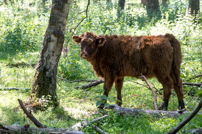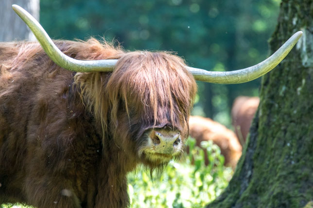 Dagegen hatten es die Hochland-Rinder, Immigranten aus Schottland, unter schattigem Blätterdach und auf kräftigem Grün stehend, deutlich angenehmer. Ihr Fell und die zotteligen Haare sind nicht wirklich für sommerliche Temperaturen geeignet. Ein Friseur wäre dringend notwendig gewesen, um den Durchblick zu gewährleisten.