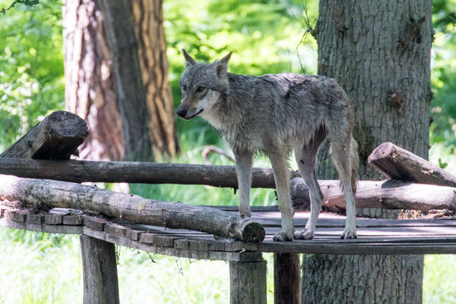 Seine Artgenossen aus dem hohen Norden, in der Anlage leicht am hellen Fell zu erkennen, waren etwas gemütlicher unterwegs. Nachdem die Polarwölfe von der höchsten Erhebung im Gehege die Lage gecheckt und für unkritisch befunden hatten, legten sie sich in den Schatten und hielten ein Mittagsschläfchen.
