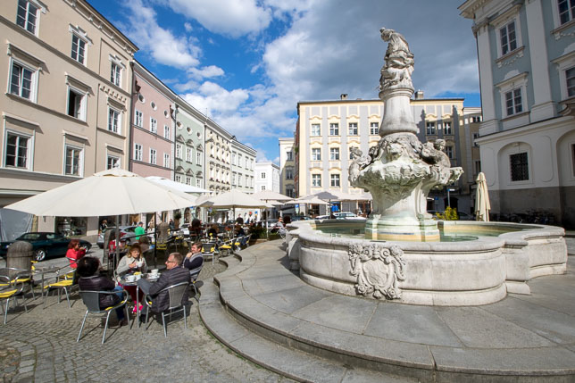 Zurück in der Altstadt endete unser Rundgang am Residenzplatz, einem wirklich schönen Platz mit mediterranem Flair, der sicherlich noch mehr an Attraktivität gewinnen wird, wenn die Bauarbeiten an der rückwärtigen Seite des Doms abgeschlossen und die Gerüste verschwunden sind. Nicht etwa die Stadtverwaltung residiert hier, sondern der Bischof von Passau hat seinen Arbeitsplatz am angrenzenden blau-weiß gestrichenen Palast. Zentraler Punkt des Platzes ist der Wittelsbacherbrunnen, der 1903 zum 100. Jubiläum der Zugehörigkeit Passaus zu Bayern aufgestellt wurde. Drum herum schmiegen sich die Sitzplätze von Cafés und laden zum Verweilen ein.
