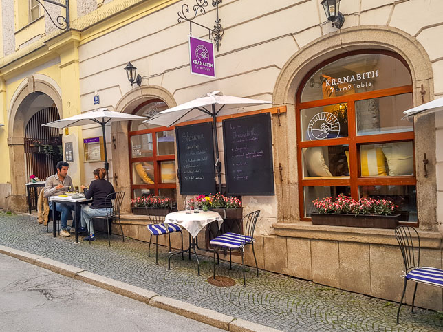 In der Höllgasse, die Kunstmeile der Stadt, weisen bunt bemalte Pflastersteine den Besuchern den Weg in die Galerien der sich hier niedergelassenen Künstler. Diese müssen aber wohl noch aus ihrem Corona-Schlaf erwachen, geöffnete Galerien waren heute noch Mangelware. Schöne Idee: Einmal im Jahr werden Farbtöpfe bereitgestellt, aus denen sich jeder bedienen kann, um an der Auffrischung der Bemalung mitzumachen.