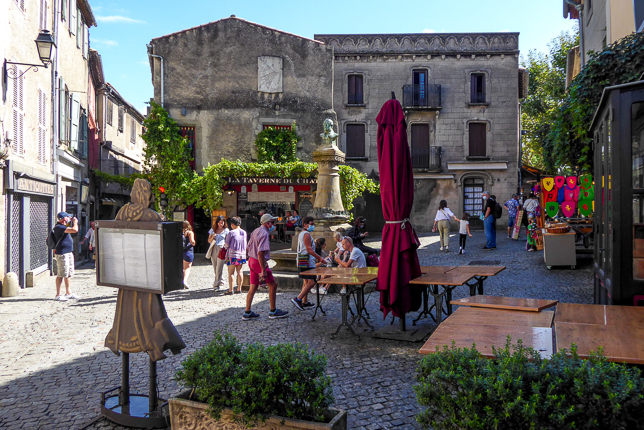 Nach dem Abstellen unserer Koffer im Hotel du Pont Vieux am Fuß des Burghügels spazierten wir hinauf zur Porte Narbonne, einem der Tore der Stadt. In den Straßen warteten Restaurants und Souvenirgeschäfte auf die Besuchermassen.
