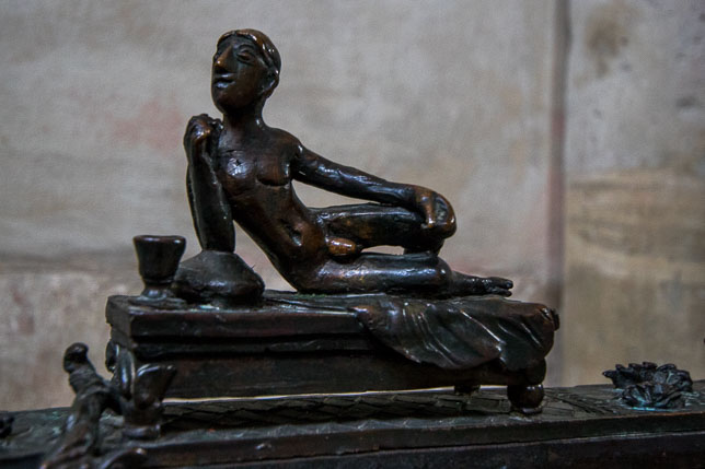 Die Führung hatte jedoch noch nicht begonnen, durch die verschärften Regelungen nutzten alle übrigen Besucher einen Audioguide für ihren Rundgang – wir waren also die ersten und einzigen Teilnehmer für die Führung. Start war in der Krypta des Doms, dem ältesten Teil des Kirchenbaus, an dessen Stirnseite ein romanisches Kruzifix (entstanden um 1160/70) den Altar schmückt und im Mittelteil zwei Wandleuchter des Künstlers Heinrich Apel in Form eines Propheten und eines Engels Licht spenden.