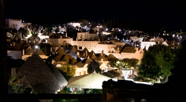 Vom Largo Martellotta geht es über kleine Gassen ins Viertel Rione Monti hinauf, wo es alles gibt, was das Touristenherz begehrt. Vorbei an Souvenirständen, Bars und Restaurants spazierten wir staunend über die vielen Besucher den Berg hinauf bis zur Chiesa Sant’ Antonio di Padova mit Trulli-Dach. Oben angekommen ging es nach ein paar Fotostopps wieder runter, die langsam einsetzende Dämmerung sorgte für eine schöne abendliche Atmosphäre im Trulli-Viertel.