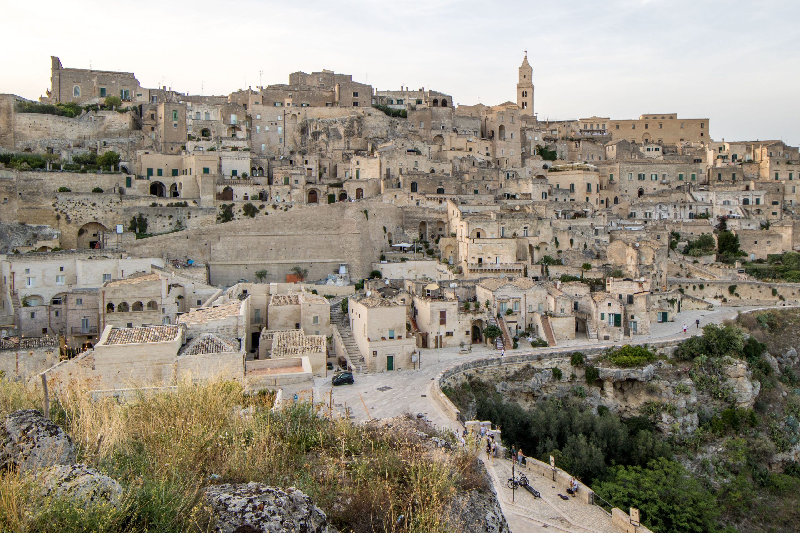 Trotz intensiver Vorbereitung am Vortag entpuppten sich ein paar Dinge vor Ort doch anders als gedacht. Die erste Ernüchterung trat ein, als wir einen Aussichtspunkt auf der gegenüberliegenden Seite des Tals gegenüber von Matera ansteuerten und leider feststellen mussten, dass die letzten 1,5 km bis zum Belvedere zu Fuß zurückzulegen waren. An sich kein Problem, aber bei über 30 Grad im Schatten (wobei schattenspendende Bäume in der kargen Landschaft kaum zu finden sind) und hoher Luftfeuchtigkeit definitiv eine schweißtreibende Angelegenheit. Zum Glück zogen ab und zu ein paar Wolken vor die Sonne. DIe Anstrengung wurde mit einem ersten beeindruckenden Blick auf die Altstadt von Matera belohnt.