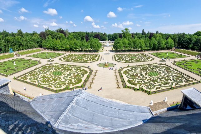 Zum Schloss gehört ein riesiger Barockgarten mit Brunnen, Statuen und Buchsbaumhecken. Am besten lässt sich die Außenanlage vom Dach des Schlosses, das im Rahmen des Rundgangs zugänglich ist, überblicken.