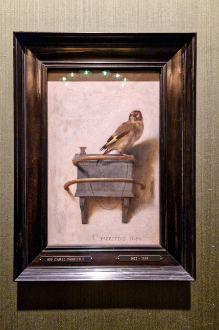 Und natürlich darf auch das Bild von Carel Fabritius, auf dem ein angeketteter Distelfink zu sehen ist, nicht fehlen. Der Maler selbst, ein Schüler Rembrandts, kam bei der Explosion eines unterirdischen Pulvermagazins in Delft am 12. Oktober 1654 ums Leben. Aus dem gleichen Jahr stammt das Bild des Distelfinks.