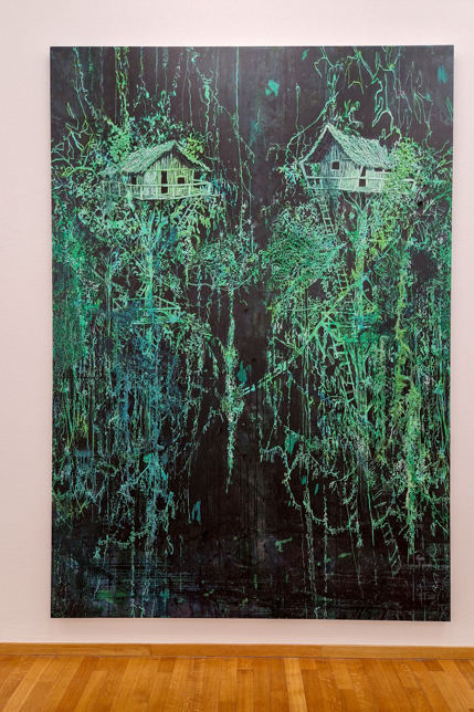 Nicht unterschlagen wollen wir die Sonderausstellung Material Worlds von Michael Raedecker, einem 1963 in Amsterdam geborenen Künstler, der mit seinem einzigartigen Verfahren Malerei und Stickerei kombiniert.