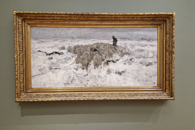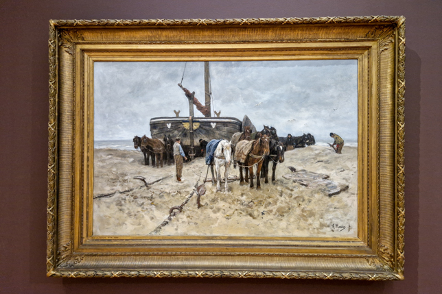 Die Sonderausstellung Die Haager Schule in einem anderen Licht widmete sich der Künstlergruppe der Haager Schule um die Maler Jozef Israëls, die Brüder Jacob und Willem Maris , Johan Hendrik Weissenbruch, Hendrik Willem Mesdag und Anton Mauve, einem Lehrer Vincent van Goghs, die sich um 1860 in Den Haag niederließen und zwischen 1870 und 1929 Szenen aus Den Haag und Umgebung einfingen. Insbesondere die Darstellung großartiger Himmel und Lichtreflexion auf dem Wasser beeindrucken den Besucher. Einem der Mitglieder, Hendrik Willem Mesdag, und seiner Frau Sintje waren wir bereits im Museum Mesdag mit seinem riesigen Panorama begegnet.