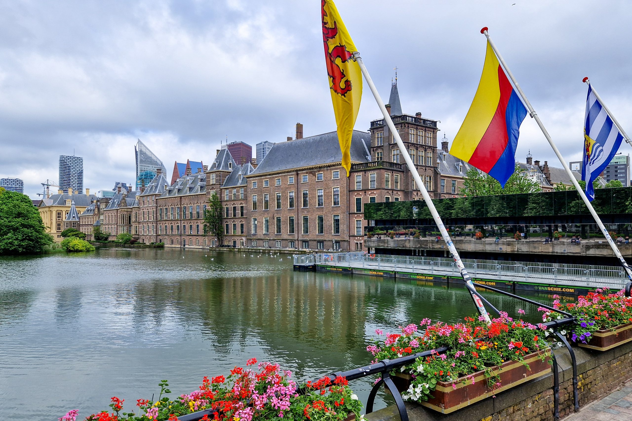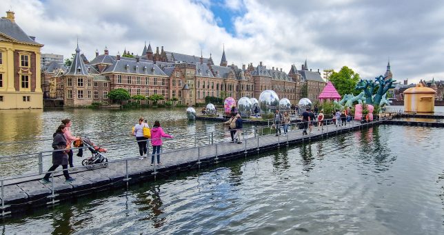 Auf dem Rückweg zum Hotel kamen wir am Hofvojjer vorbei, einem kleinen Weiher, der direkt an den Binnenhof, den aktuell aufgrund von Renovierungsarbeiten geschlossenen Regierungssitz grenzt: an einer Ecke präsentierte das Festival BlowUp Art Den Haag auf einem Ponton aufblasbare Kunstgegenstände.