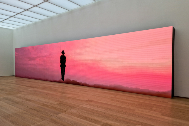 In Sam Taylor-Johnsons Videoinstallion “Sigh” steht der Besucher mitten im Raum, um ihn herum spielt auf großen Bildschirmen das BBC-Orchester auf nicht vorhandenen Instrumenten ein eigens komponiertes Musikstück, so dass man sich mitten im Orchester wähnt.