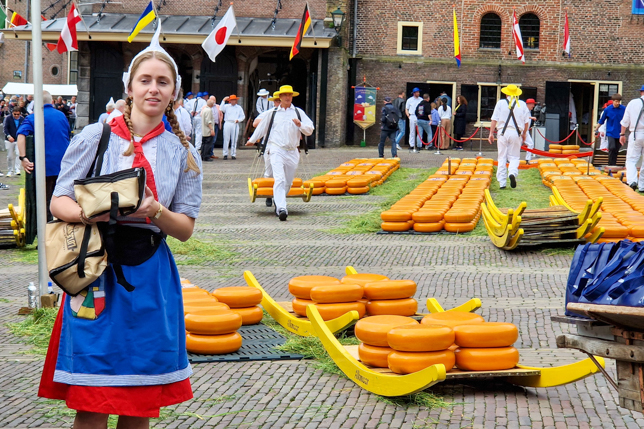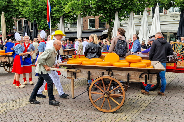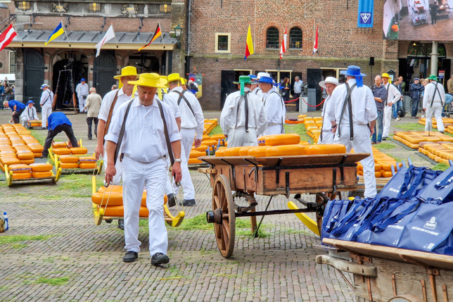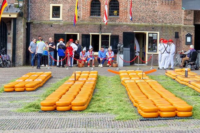 Der Käsemarkt beginnt jeden Freitag Anfang April bis Ende September pünktlich um 10 Uhr mit dem Schlagen der Käseglocke. Zu Beginn liegen etwa 2400 Käselaibe und damit beeindruckende 30.000 Kilogramm Gouda- und Edamer-Käse in langen Reihen ausgelegt bereit, die im Laufe des Vormittags unter den wachsamen Augen des Marktmeisters von den Käseträgern zum Wiegen, Preis verhandeln, Qualität testen und späteren Abtransport hin- und her bewegt werden.