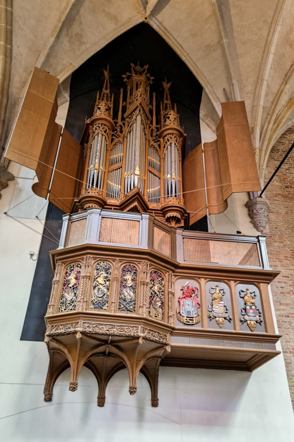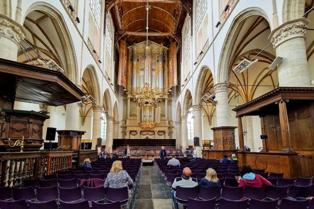 Auf dem anschließenden Rundgang spazierten wir einmal quer durch die Altstadt am Rathaus vorbei zur Sint Laurenskerk, die zwischen 1470 und 1520 im gotischen Stil erbaut wurde. Bei einem Rundgang über den unzähligen Grabplatten der bis zum Jahr 1830 beerdigten Alkmaarer Bürger konnten wir die beiden Orgeln der Kirche bewundern. Die Chororgel aus dem Jahr 1511 ist die älteste bespielbare Orgel der Niederlande, die 1639 bis 1646 erbaute Große Orgel beeindruckt durch die mächtigen Pfeifen und das schöne geschnitzte Orgelprospekt. Im Sommer werden jeden Freitag, am Tag des Käsemarktes, die beiden Orgeln um 12 Uhr bespielt. Und so konnten wir dem virtuosen Spiel des erst 22jährigen Jan Hogendoorn, einem Musikstudenten an der Universität von Utrecht, lauschen.