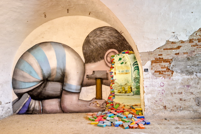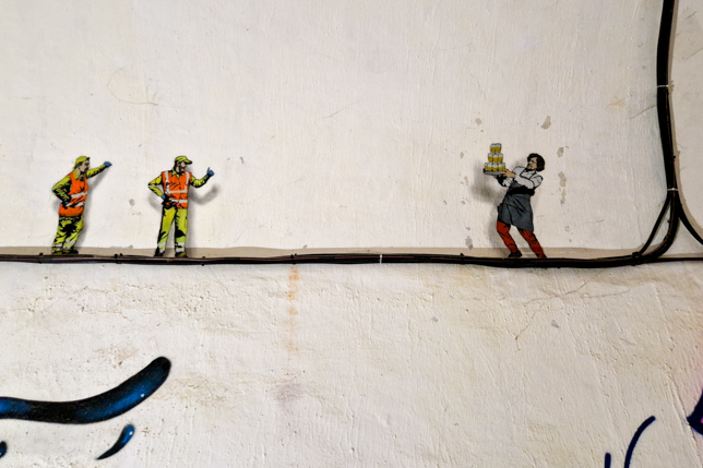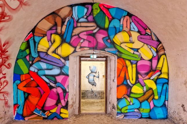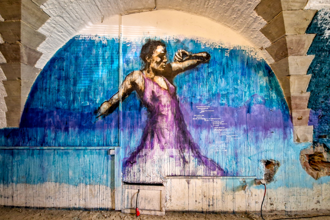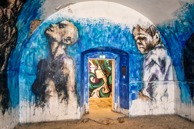 Witzige, originelle und künstlerisch anspruchsvolle Arbeiten zieren seitdem die Wände und es kommen immer wieder neue Kunstwerke dazu. Ein positiver Nebeneffekt der Besichtigung für uns war, dass es in den Gewölben bei teilweise unerträglichen Außentemperaturen angenehm kühl war.