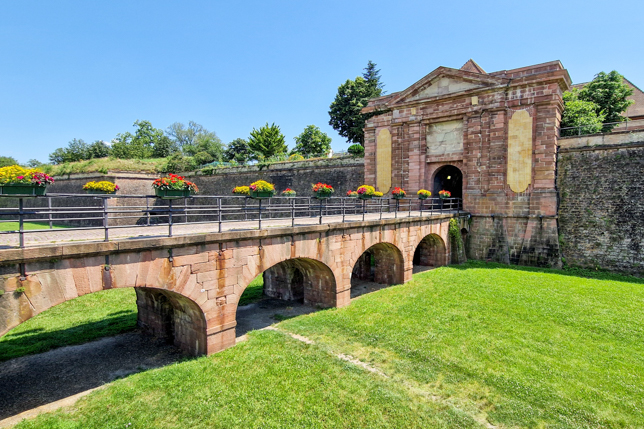 Unser erster Halt in Neuf-Brisach, südöstlich von Colmar gelegen, ist gar nicht so neu wie es der Name vermuten lässt, auf alle Fälle aber jünger als das auf der gegenüberliegenden Rheinseite gelegene Breisach. Die ganze Schönheit der Stadt und ihre ungewöhnliche Grundform sieht man leider nur aus der Vogelperspektive, aus der sich ein perfekter Stern offenbart. Die Stadt wurde Anfang des 18. Jahrhunderts von Sébastien Le Prestre de Vauban, dem Architekten des Sonnenkönigs Ludwig XIV. entworfen, der für unzählige Bauten in Frankreich verantwortlich ist. Nachdem Ludwig XIV. das rechtsrheinische Breisach annektiert hatte, die Befestigung ausbaute, die Stadt aber nach dem Ende des pfälzischen Erbfolgekrieges wieder abgeben musste, entstand auf der gegenüberliegenden linken Rheinseite die sternförmige Befestigungsanlage Neuf-Brisach mit einem Straßennetz in Schachbrettform und einem zentralen Exerzierplatz.
