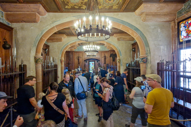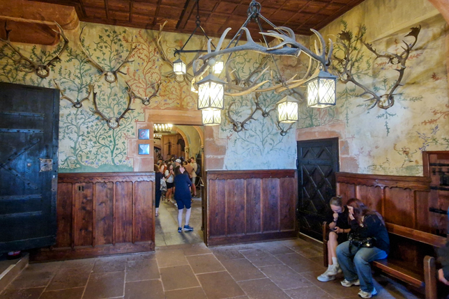 Montags öffnet die Burg erst um 10:30 Uhr ihre Tore – sollten wir zu dieser Uhrzeit vor Ort sein, dachten wir, könne es doch kein Problem sein, einen der begrenzten Parkplätze zu bekommen. Einen Parkplatz fanden wir, vom Besucherandrang zu dieser Zeit waren wir allerdings schon überrascht. Oben angekommen, bildete sich vor den vier Kassen eine rund 100 Meter lange Schlange, und es dauerte schon eine Weile, bis wir endlich die Eintrittskarten kaufen konnten. So war es nicht verwunderlich, dass die Räume in der Burg bei der Besichtigung teilweise überfüllt waren. Im Gegensatz dazu war unsere Gruppe mit Führung auf Deutsch, die wir für zusätzliche zwei Euro gebucht hatten, recht überschaubar – sie bestand aus dem Gästeführer und uns beiden.