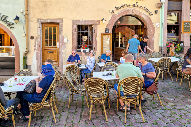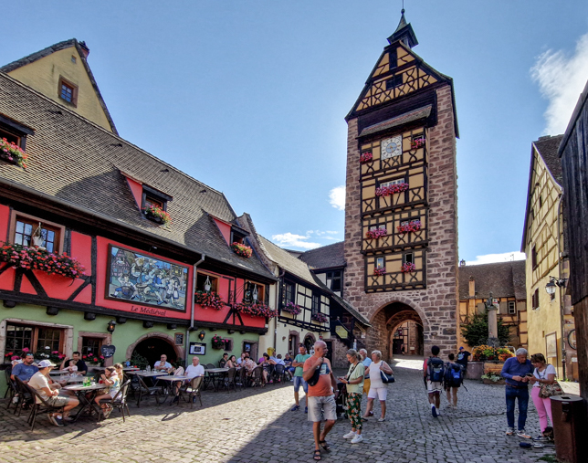 Während wir in Ribeauvillé etwas über 2 km den Ort mit einigen wenigen weiteren Touristen erkundet hatten, war der Weg in Riquewihr vom Parkplatz über die ansteigende Rue du Général de Gaulle bis hinauf zum Wahrzeichen des Ortes, dem Dolder, deutlich kürzer. Wir hatten den Eindruck, dass deutlich mehr Touristen den Weg nach Riquewihr suchten, aber vielleicht konzentrierten sich diese einfach auf einen kleineren Raum.