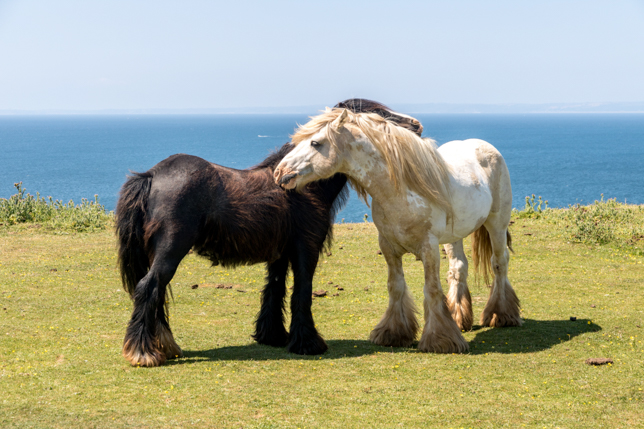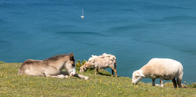 Von Three Cliffs Bay waren es dann nochmal 20 Minuten Fahrt bis in die südöstlichste Ecke der Halbinsel. Bei Worms Head liegt eine bei Flut teilweise überspülte Landzunge vor der Küste, deren drei Inseln mit etwas Fantasie an eine Seeschlange erinnern. Auf den Wiesen rund um den Aussichtspunkt grasen Pferde und Schafe völlig ungestört von den Touristen am Rande der Klippen im Wind.
