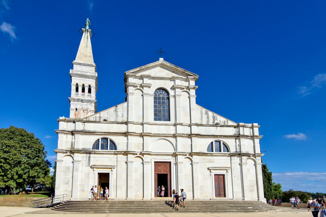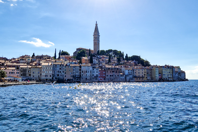Die auf einer Halbinsel liegende Altstadt von Rovinj wird gekrönt von Santa Eufemia, einer der Heiligen Euphemia geweihten Barockkirche. Den 60m hohen Kirchturm schmückt eine Kupferstatue der Heiligen, die sich wie eine Wetterfahne im Wind dreht.