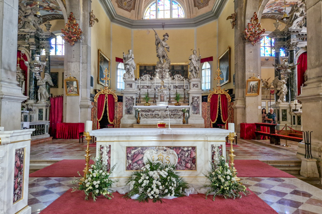 Im Innern fällt der Blick auf den Hauptaltar mit dem Drachentöter Hl. Georg im Zentrum. Auf der rechten Seite steht die Figur der Hl. Euphemia, mit Mühlrad und der Stadt Rovinj in den Händen. Die Heilige wurde im 3. Jahrhundert gefoltert (daher die Darstellung mit Mühlrad), da sie während der Christenverfolgungen im Römischen Reich ihrem christlichen Glauben nicht entsagen wollte. Schließlich wurde sie Löwen vorgeworfen, die sie aber nicht auffraßen – erst der Henker konnte sie in der Löwengrube erdolchen.