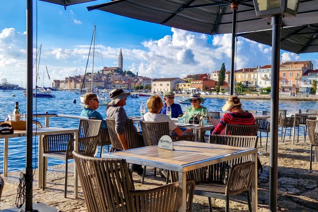 Wir umrundeten einmal das Hafenbecken, wo Boote auf den Wellen schaukelten und an dessen Ufer Restaurants auf hungrige Touristen warteten. Im Restaurant Maestral mit Blick auf die Altstadt von Rovinj ließen wir uns nieder. Aufwendiges Übersetzten der Speisekarte konnten wir uns schenken, es gab eine deutsche Ausgabe und auch die Bestellung unserer Nudeln bzw. des Caesar Salads konnten wir in Deutsch aufgeben.