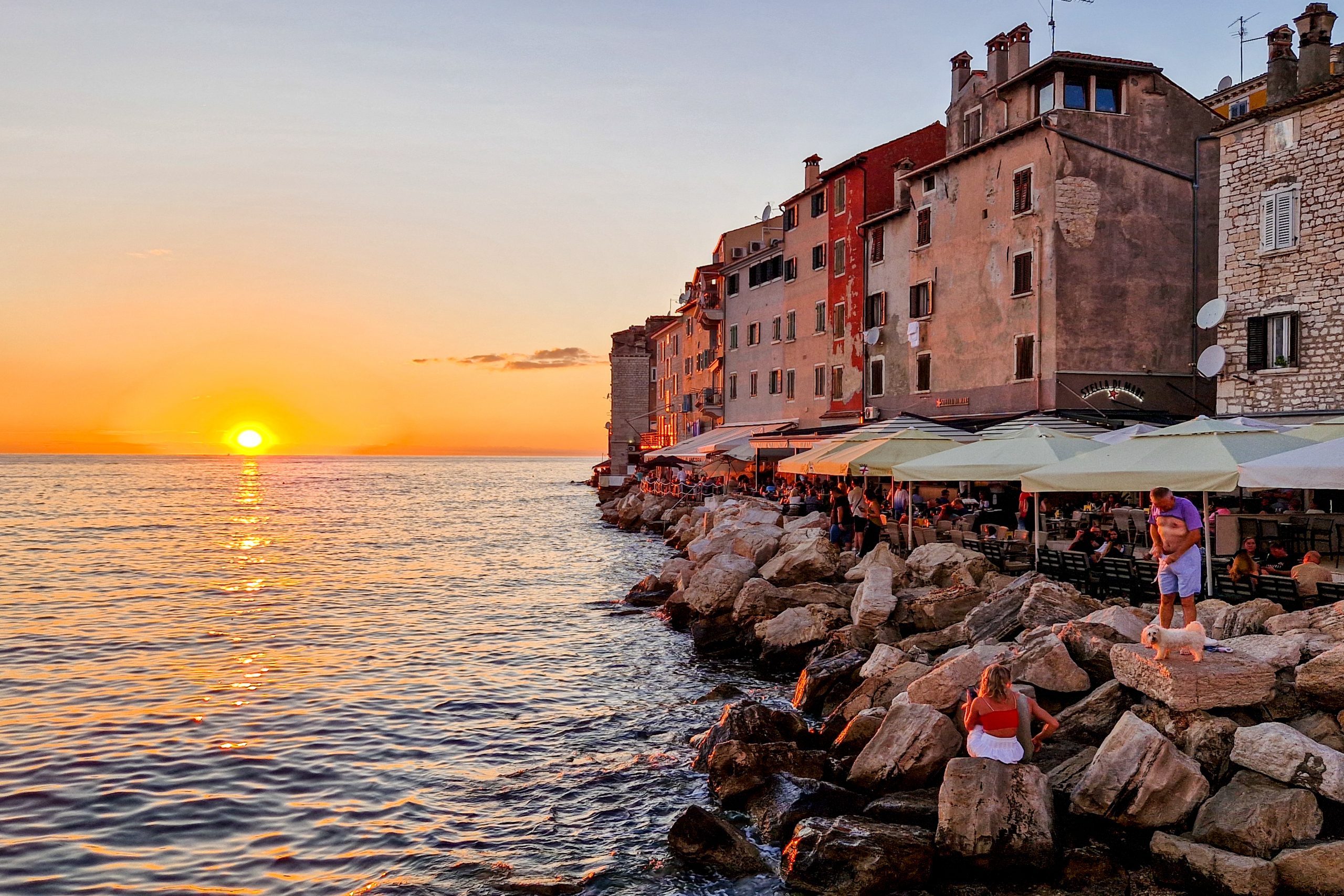Auf dem Weg zurück konnten auch wir den Verlockungen einer der vielen Eisdielen (genauer gesagt der “aROMA Gelato Experience Boutique Rovinj” mit handwerklich hergestelltem Eis aus natürlichen Zutaten) nicht widerstehen, schauten dem Treiben rund um das Hafenbecken zu und lauschten den – mal mehr, mal weniger talentierten – Straßenmusikern. Bevor wir uns eine Bar für ein letztes Getränk suchten, wartete ein wunderschöner Sonnenuntergang auf uns – und nicht nur auf uns. Ein Spektakel, das bei wolkenfreiem Himmel jeden Abend stattfindet, jedoch nichts von seiner Faszination verloren hat, was man an der Vielzahl der Touristen sehen konnte, die wie wir auf die im Meer versinkende Sonne schauten.