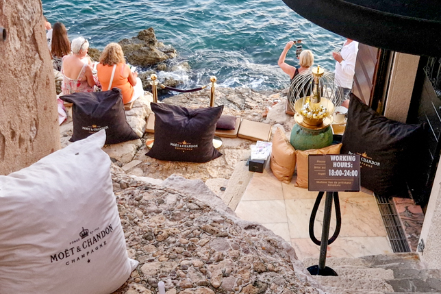 In Vorbereitung auf unseren Urlaub hatten wir einen Reisebericht gesehen, in dem die Valentino Cocktail & Champagne Bar mit Sitzplätzen auf den Felsen direkt am Meeresufer vorgestellt wurde. Wie der Name vermuten lässt, gibt es dort ausschließlich Cocktails und Champagner. Wir gönnten uns einen guten wenn auch recht teuren Cocktail, wobei ein Teil des Preises sich bestimmt durch den wunderschönen Platz am Meer begründet.