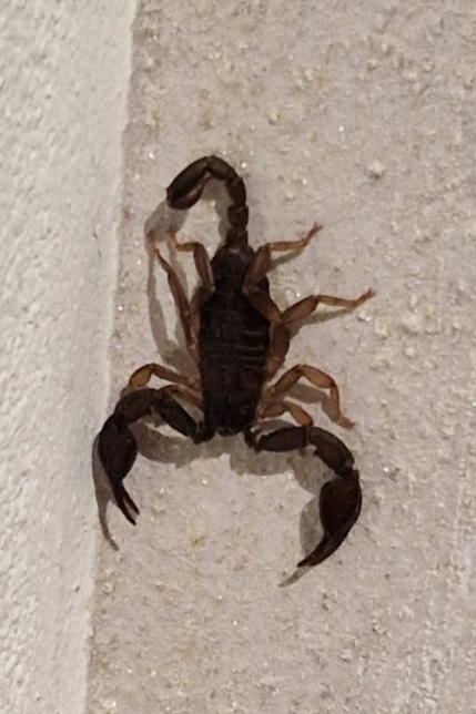 Spät abends entdeckte Alex ein “Haustier”, das sich vor dem Regen in unser Schlafzimmer verkrochen hatte: Den vom Kuscheltier weit entfernten Skorpion wollten wir dann aber doch nicht über Nacht bei uns behalten. Mit einem Glas bewaffnet sorgte Jochen freundlich, aber bestimmt dafür, dass der Knabe die Nacht (und hoffentlich auch die folgenden) im Freien verbringen musste.