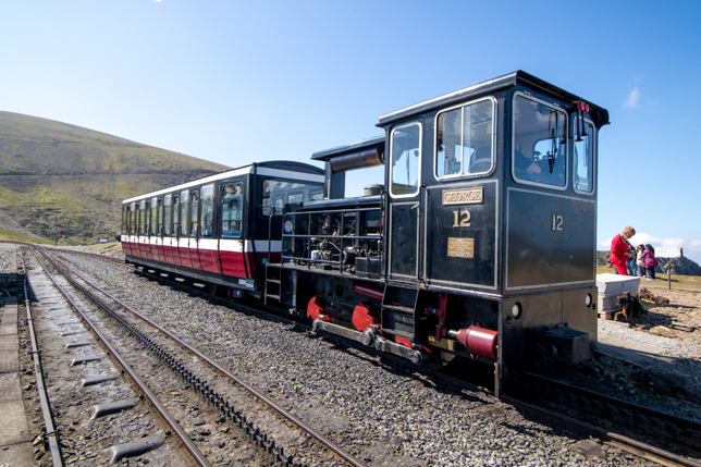 Vor der Fahrt auf den höchsten walisischen Berg Mount Snowdon muss jeder Besucher eine Entscheidung zu treffen: Möchte man via original Schweizer Dampflokomotive oder traditioneller Diesellokomotive der Snowdon Mountain Railway den Berg hinaufgeschoben werden? Wir entschieden uns letztendlich für die modernere Variante ohne Dampf. Die Tickets hatten wir bereits zwei Wochen im Voraus gebucht, da die Fahrt für viele zu einem der Highlights eines Urlaubs in Wales zählt und so die Plätze in den Zügen schnell ausgebucht sind. Zum Zeitpunkt unseres Besuchs war leider der letzte Teil der insgesamt 7,5 km langen Strecke hinauf zur Bergstation (auf 1.064 m) wegen Renovierungsarbeiten gesperrt, aber auch vom auf 772 m hoch gelegenen Halt Clogwyn hatten wir einen wunderschönen Rundumblick auf die Berge des Snowdonia Nationalparks.