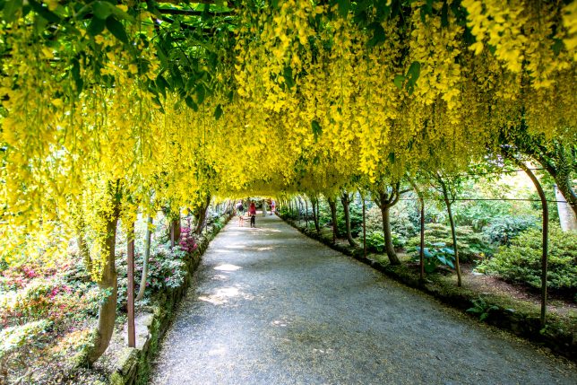 Besonders beeindruckend und sicherlich das beliebteste Fotomotiv im Garten ist der berühmte 55 Meter lange Blumentunnel aus Goldregen, der von Mitte Mai bis Anfang Juni blüht – genau zur Zeit unseres Besuchs.