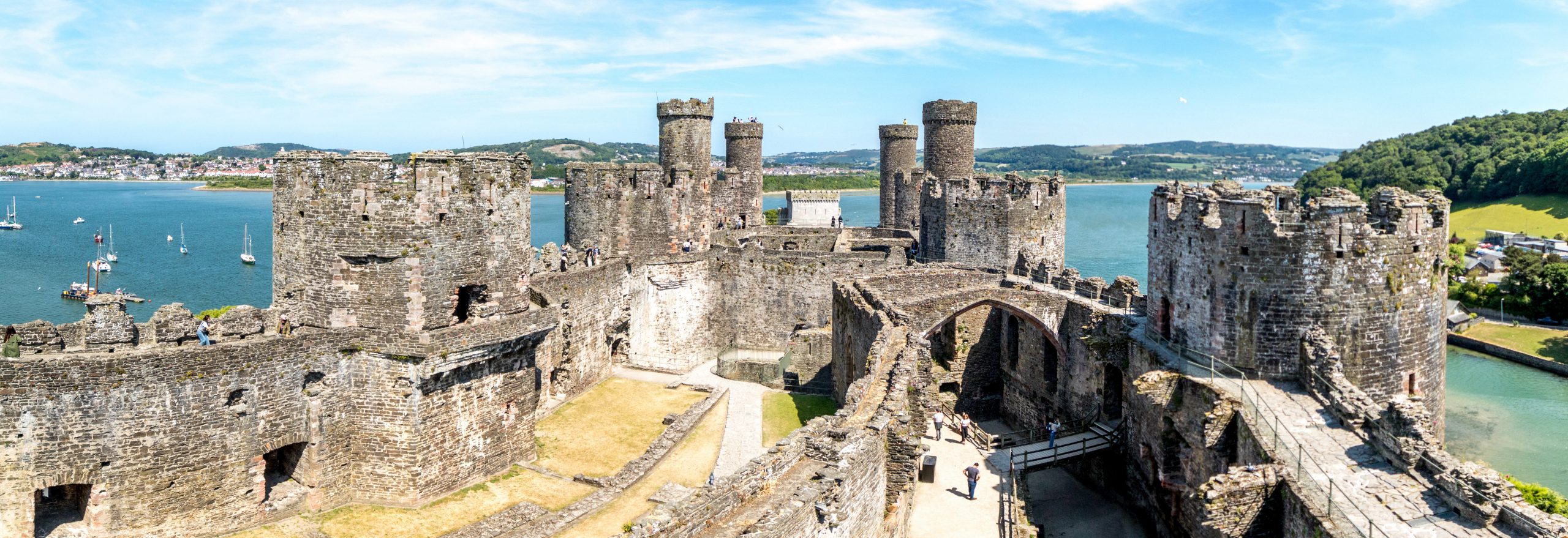 Conwy Castle ist mit einer Größe von 90 mal 30 Metern Umfang eine der größten Burgen in Wales. Die Burgmauer, die noch vollständig intakt ist, wird von acht Wehrtürmen mit einem Durchmesser von 12 Metern unterbrochen. Für die damaligen Herrscher war der Ausblick auf sich nähernde Feinde sicher ein Grund, die Burg an dieser Stelle zu errichten. Heutige Besucher achten mehr auf die wunderschöne Kulisse mit der Burg im Vordergrund und der Mündung des Flusses Conwy im Hintergrund.