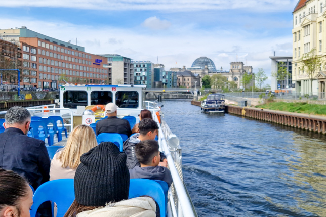 Bei der Wahl zwischen dem Besuch des Jüdischen Museums und einer einstündigen Fahrt mit einem Ausflugsboot auf der Spree durch die Mitte Berlins entschieden wir uns für die Bootsfahrt. Da sich die Abfahrtszeit für den Zug nach Hause kurzfristig auf den Nachmittag geschoben hatte, blieb uns bis 15 Uhr Zeit für Unternehmungen. Zum Glück checkten wir noch einmal die aktualisierten Zugtickets und stellten fest, dass der Zug anstelle des Hauptbahnhofs als Startpunkt ausnahmsweise ab dem Bahnhof Lichtenberg losfuhr. Grund waren Bauarbeiten am Hauptbahnhof über Ostern.