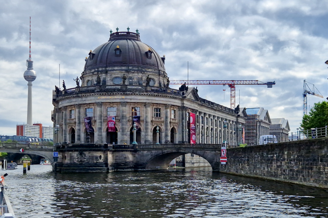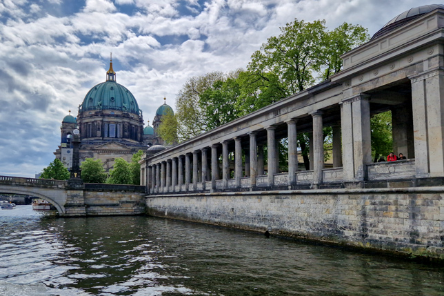 Um 11 Uhr startete dann die Bootstour Richtung Westen vorbei an der ehemalige Grenzübergangsstelle zwischen Ost- und West-Berlin Tränenpalast, dem Reichstagsgebäude, Bundeskanzleramt und Haus der Kulturen der Welt. In der entgegengesetzten Richtung konnten wir im Anschluss die historischen Gebäude der Museumsinsel vom Wasser aus bewundern, passierten den Dom bis zum ältesten Siedlungsgebiet der Hauptstadt, dem Nikolaiviertel: Fast vollständig im 2. Weltkrieg zerstört, wurde es zwischen 1980–1987 anlässlich der 750-Jahr-Feier der Stadt wiederaufgebaut, inklusive der Rekonstruktion der Nikolaikirche mit ihren markanten Doppeltürmen.