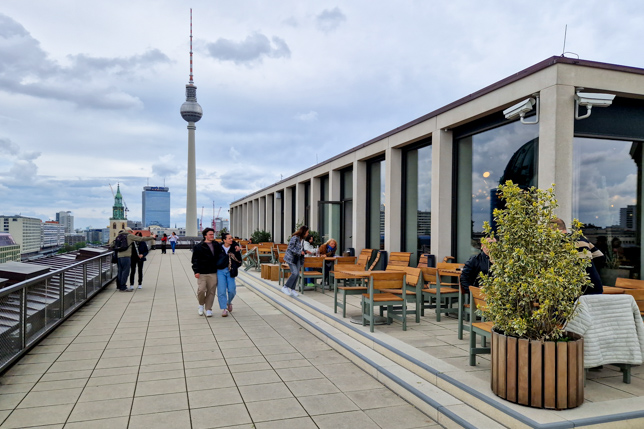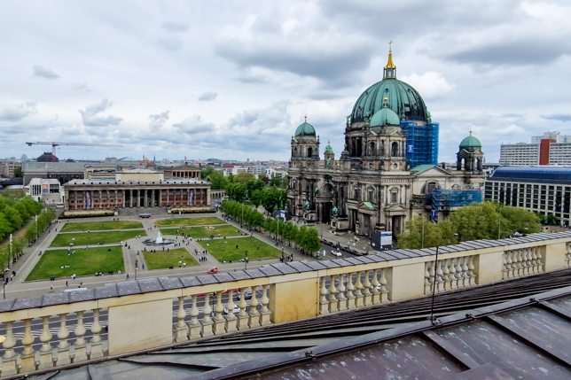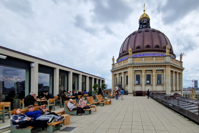Wieder am Ausgangspunkt unserer Tour Friedrichstraße angekommen, spazierten wir zum Humboldt Forum, um uns von oben von Berlin zu verabschieden. Für 3 Euro können Besucher mit dem Aufzug zur Dachterrasse hinauf fahren, den Blick auf Berlin und die Kuppel des Humboldt Forums werfen oder auf den Stühlen des Restaurants Baret Platz nehmen.