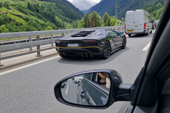 Während der Tunnel auf etwa 1.100m ü.M. den Berg quert, schraubt sich die Passstraße bis zum höchsten Punkt auf 2.107m ü.M. Durch die Sperrung des Tunnels war entsprechend viel Verkehr auf der kurvenreichen Straße. Auf der Nordseite der Alpen hatten die Wolken den Blick auf die Berggipfel freigegeben und so hofften wir auf grandiose, spektakuläre Alpenpanoramen – die wir jedoch begraben mussten, als wir kurz vor der Passhöhe in tiefliegende Wolken fuhren.