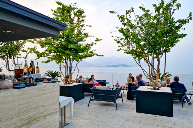 Für das letzte Getränk des Abends wählten wir die Sky Bar des Hotels La Palma mit herrlichem Blick über den See und die Borromäischen Inseln – auch wenn wir als Nicht-Hotelgäste mit der dritten Reihe vorlieb nehmen mussten. Hier oben hatten sich die Schönen und Reichen versammelt, oder die, die es gerne wären. Wir ließen uns unseren Cocktail für 18 EUR schmecken, beobachteten von unseren billigen Plätzen das Geschehen und genossen die langsam angenehmer werdenden Temperaturen bei einsetzenden Dunkelheit, wobei das Thermometer des Autos auf der Rückfahrt immer noch 27 Grad anzeigte.