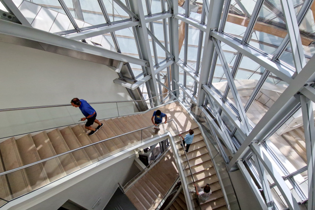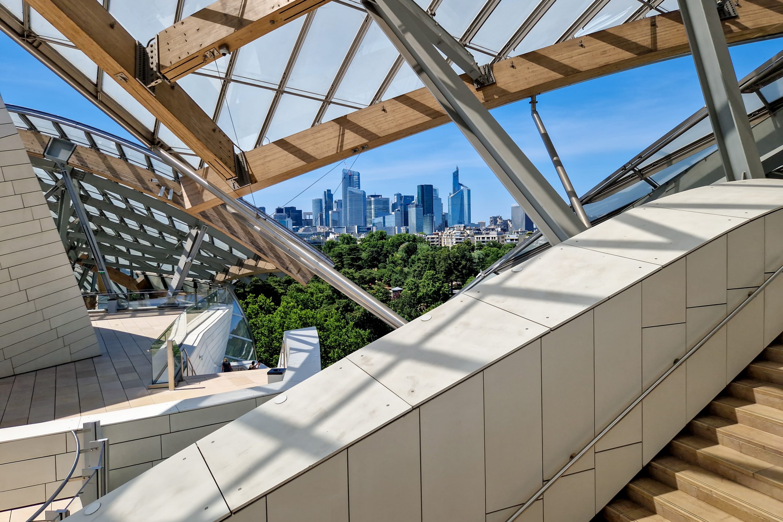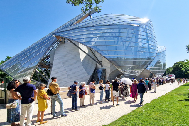 Das Gebäude der Fondation Louis Vuitton ist ebenso ein Kunstwerk wie die Ausstellungen, die es beherbergt. Das Gebäude besteht aus mehreren „Segeln“ aus Glas, die das Licht reflektieren und gleichzeitig Leichtigkeit und Transparenz erzeugen. Neben der beeindruckenden Architektur bietet es auch einen spektakulären Blick auf den nahegelegenen Park und das Stadtbild von Paris, insbesondere von der Dachterrasse aus.