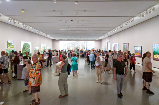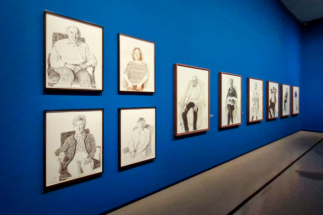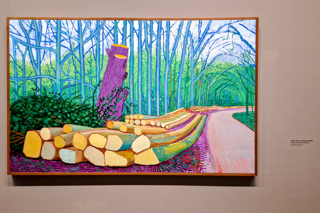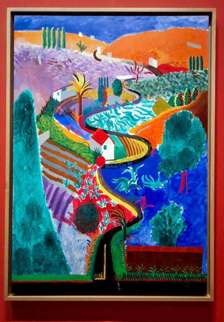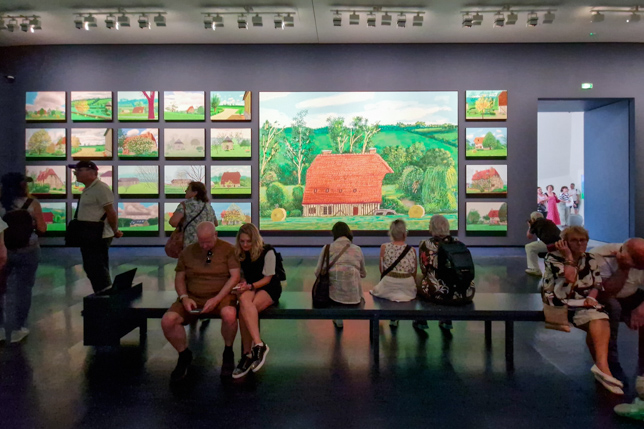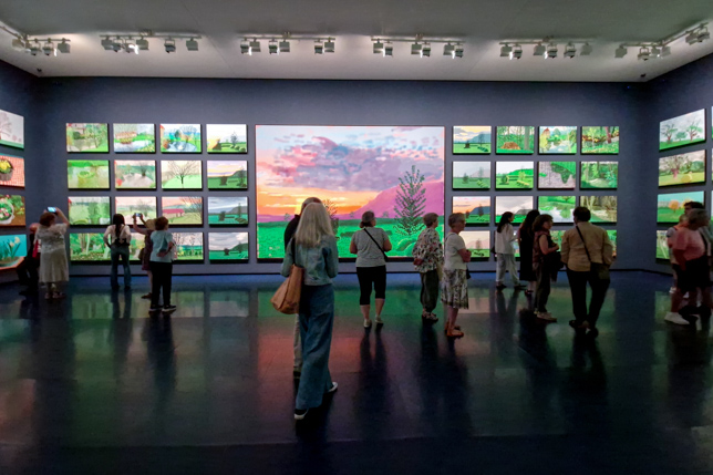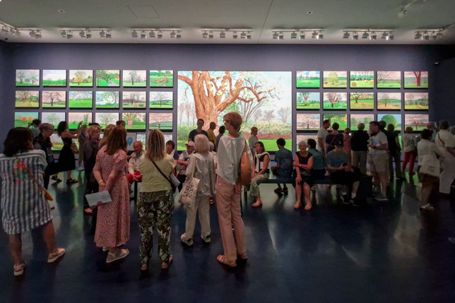 Die Ausstellung zeigte eine Auswahl von Werken, die von 1955 bis in die Gegenwart reichten. Sie umfasste Gemälde, Zeichnungen, Fotografien und digitale Werke – vor allem seine ikonischen iPad-Zeichnungen. Besonders faszinierend waren die großformatigen Landschaftsbilder, die oft von seinen Reisen inspiriert sind, insbesondere aus Kalifornien und der nordenglischen Heimat. Hier ein paar Eindrücke unseres Rundgangs durch die riesige Ausstellung: