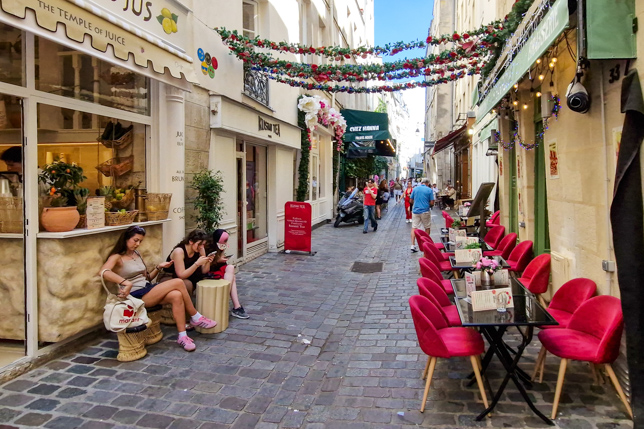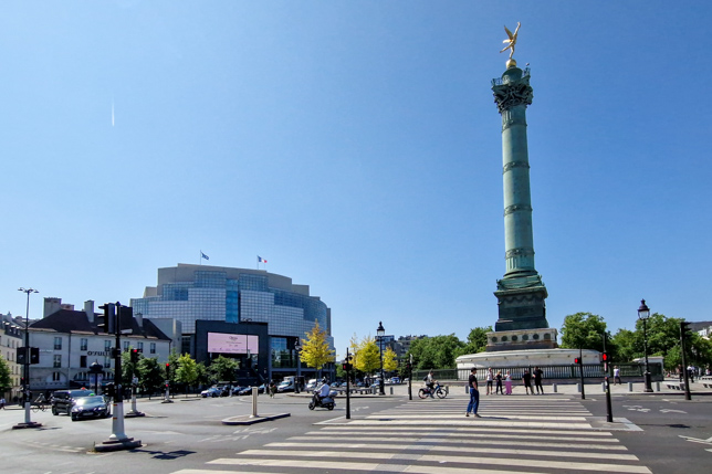 Das Marais-Viertel im 3. und 4. Arrondissement von Paris war einst Adelssitz, später Zufluchtsort für Künstler und jüdische Gemeinden. Heute ist es ein Mix aus Historie, Mode, Galerien, kulinarischen Genüssen und unser Start in den Tag: Einer der für Paris so typischen riesigen Kreisverkehre an Place de la Bastille war der Ausgangspunkt. Der Name deutet bereits daraufhin, dass hier die Französische Revolution mit der Erstürmung der Bastille am 14. Juli 1789 ihren Anfang nahm. Vom ehemaligen Staatsgefängnis ist heute nichts mehr zu sehen, in der Mitte des Platzes ragt die monumentale Julisäule empor, die an die Revolution im Juli des Jahres 1830 erinnert.