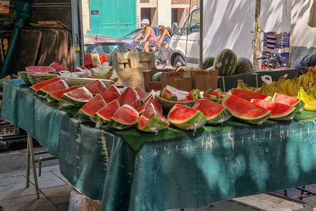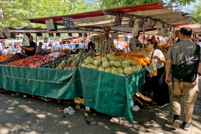 Donnerstags und Sonntags findet hier der Marché Bastille, einer der größten Lebensmittelmärkte von Paris statt. Es gibt alles, was das Pariser Herz begehrt. Die Gemüse-, Fleisch- und Fischhändler buhlten um die Gunst der Besucher, während bei letzteren bereits zur Mittagszeit (bei den heißen Temperaturen +ber 30 Grad) Rinnsale von geschmolzenem Eis von den Ständen herabtropfte.