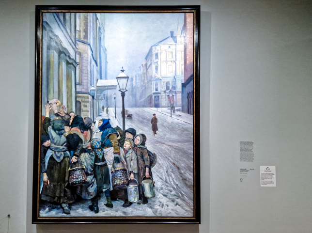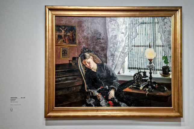 Alex erinnerte sich an ein Gemälde von Christian Krogh, das wir vermutlich bei unserer Norwegen-Reise im Museum in Oslo gesehen hatten: Krohg zeigt die Zerbrechlichkeit der menschlichen Existenz durch dieses sterbende junge Mädchen, das wahrscheinlich Tuberkulose hat. Die Kargheit der Szene sorgt dafür, dass das Bild zeitlos bleibt.