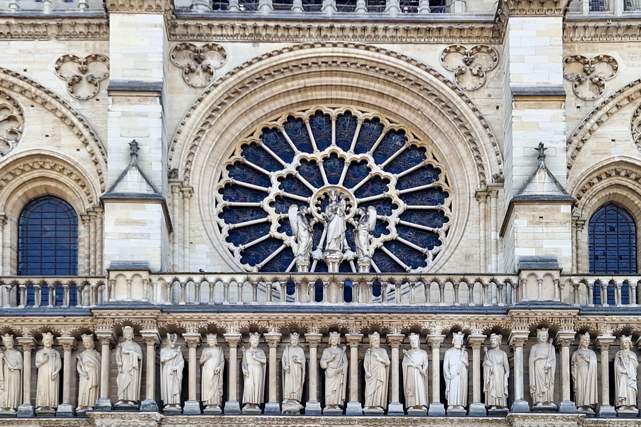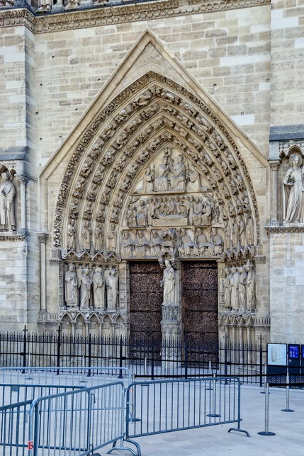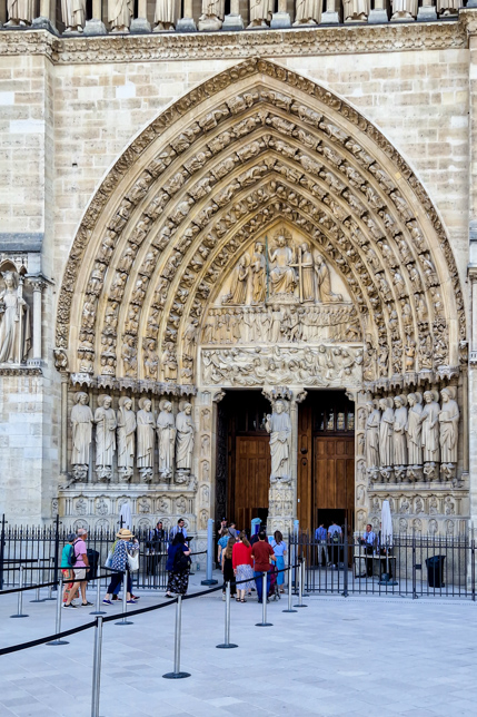 Pünktlich um 9:45 Uhr konnten wir die Kathedrale ohne Anstehen zu der reservierten Uhrzeit betreten, während sich Besucher ohne Eintrittskarte in eine andere Warteschlange einsortieren mussten, bei der es jedoch noch relativ zügig voran ging – als wir die Notre Dame eine Stunde später verließen, war diese Schlange deutlich angewachsen mit entsprechend längeren Wartezeiten. Da wir schon um halb zehn vor Ort waren, konnten wir die prachtvolle Westfassade ausgiebig studieren. Als Besucher betritt man die Kirche durch das sogenannte Weltgerichtsportal, dem mittleren von insgesamt drei reich verzierten Portalen.