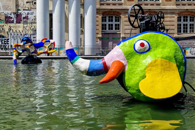 Gleich nebenan auf der Place Igor Stravinsky steht der gleichnamige Brunnen, entworfen vom Schweizer Bildhauer Jean Tinguely und seiner Ehefrau, der französisch-schweizerischen Künstlerin Niki de Saint Phalle. Unverkennbar bewegen sich die Maschinenkonstruktionen von Tinguely neben den farbenprächtigen Figuren seiner Frau in Form von Vögeln, einer Schlange, einem Elefantenkopf, einem Herz und eine Meerjungfrau-Nana.