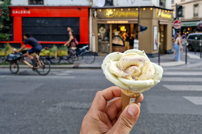 Sie empfahl uns bei der Verabschiedung die Eisdiele Amorino in der Nähe des Canal Saint-Martin, die nicht nur hervorragendes Eis im Angebot hat, sondern dies auch noch kunstvoll arrangiert. Das ließen wir uns natürlich nicht zweimal sagen.