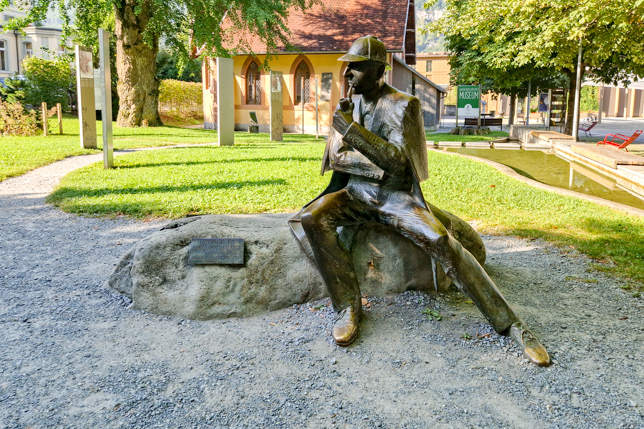 Bei den zu erwartenden Temperaturen boten sich Ziele mit kühlender Wirkung an, zu denen Wasserfälle und tiefe Schlucht zählen. In der Nähe von Meiringen östlich des Brienzersees startete nach einer ca. 30 minütigen Fahrt Zugfahrt über Interlaken-Ost meine Tour am Bahnhof. Mitten im Dorf hat man dem britischen Schriftsteller Arthur Conan Doyle, Erfinder von Sherlock Holmes, ein Denkmal gesetzt.