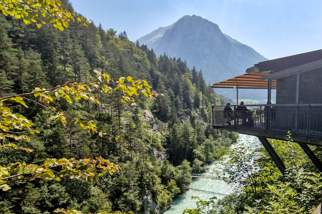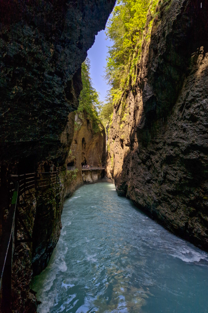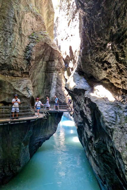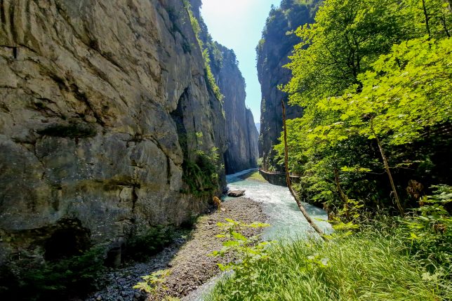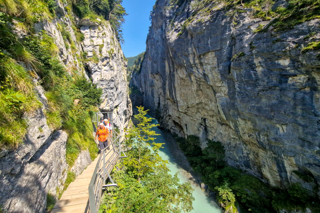 Vom Fuß der Reichenbachfalls verlief der Wanderweg durch Wälder und über Wiesen in östlicher Richtung bis hinunter zum Ufer des Flusses Aare, der sich zwischen Innertkirchen und Meiringen auf einer Länge von 1.400m tief in den Kalkstein gegraben hat. Die Wände der Schlucht, die an ihrer breitesten Stelle vierzig Meter, an der schmalsten Stelle jedoch nur ein Meter breit ist, ragen bis zu 180 m in die Höhe.