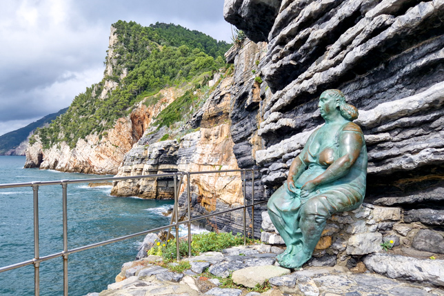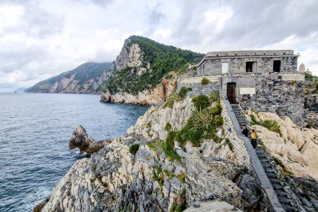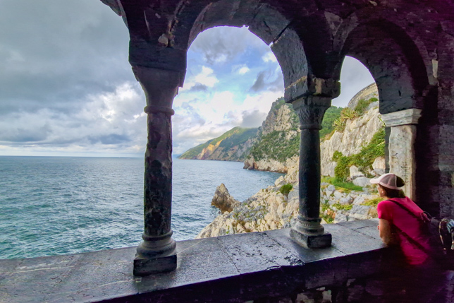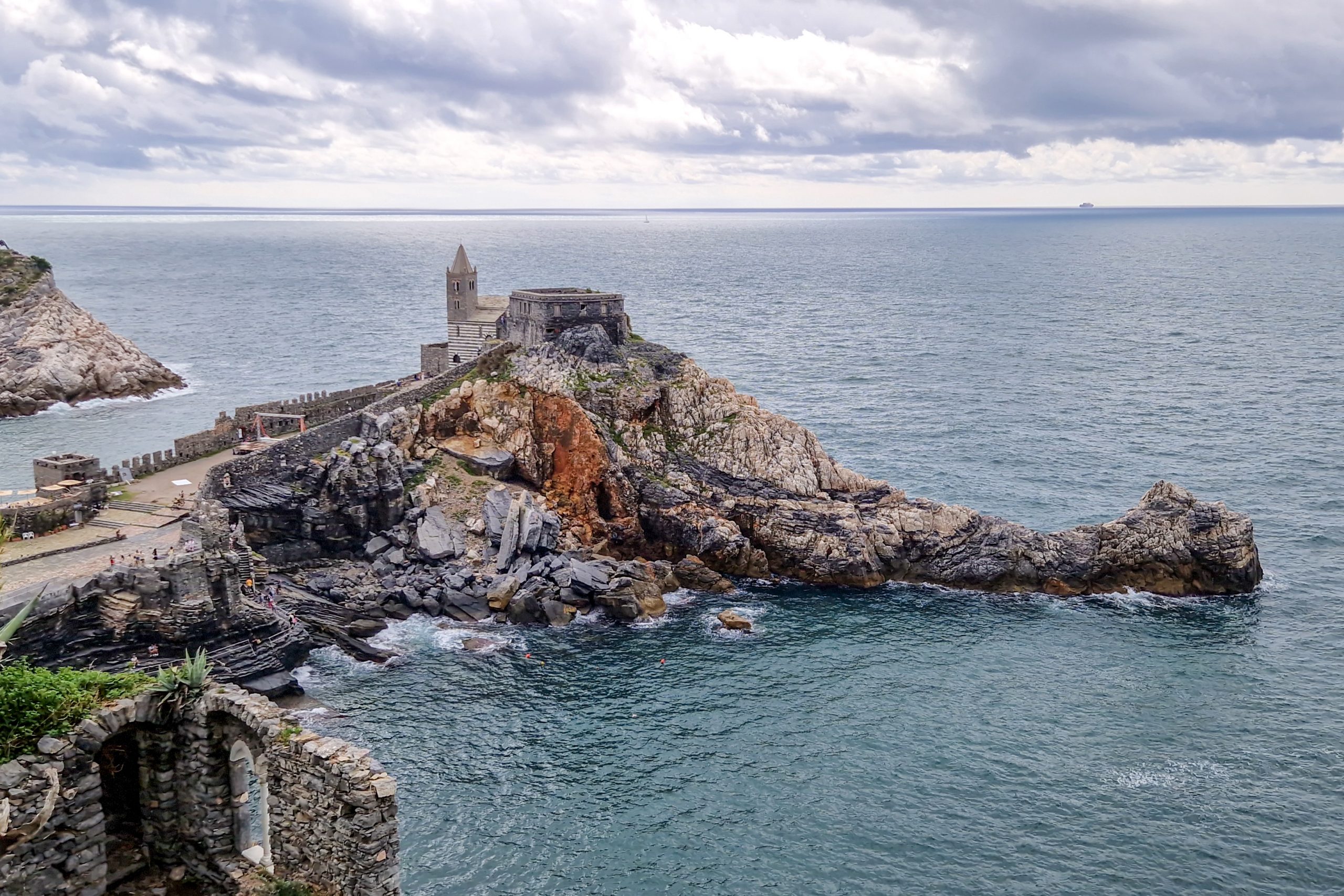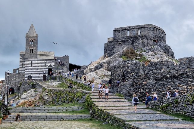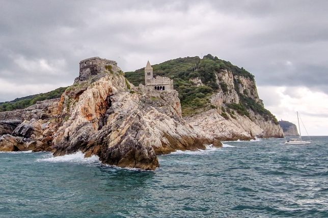Wir spazierten durch das alte Stadttor, dessen Inschrift an die Eroberung Portoveneres durch die Genuesen im Jahr 1113 erinnert. Der späteren Eroberung durch Touristenmassen ist dagegen keine separate Inschrift gewidmet. Am Ende der schmalen Altstadtgasse, die vorbei an allerlei kulinarischen Verlockungen führte, erreichten wir die schroffe, felsige Küste mit einem traumhaften Blick auf die Kirche San Pietro, die auf ihrer Felsenklippe seit Jahrhunderten Wind und Wetter trotzt.
